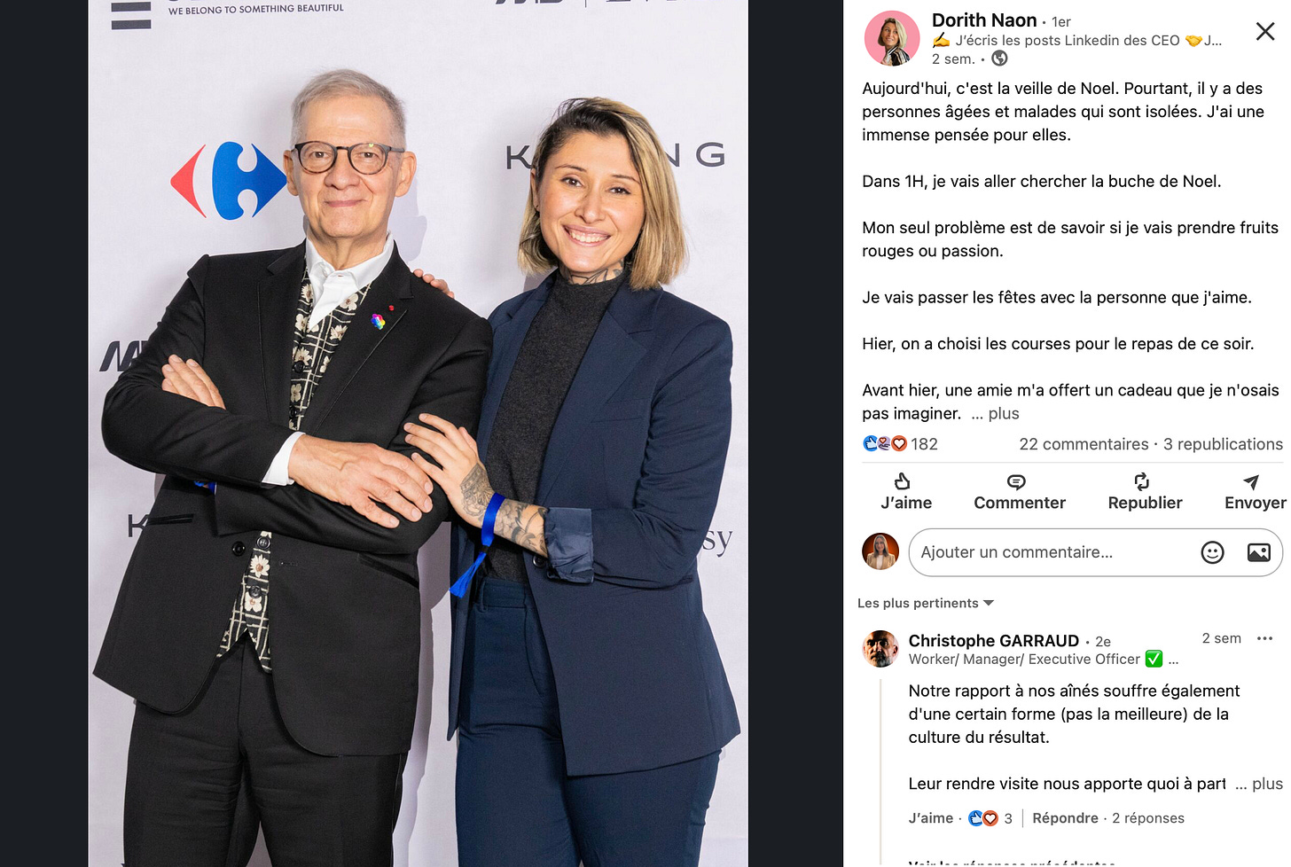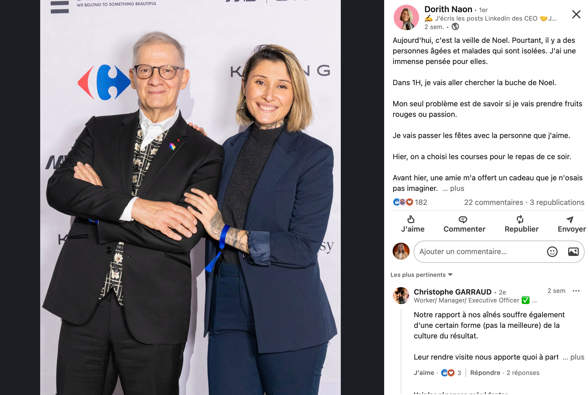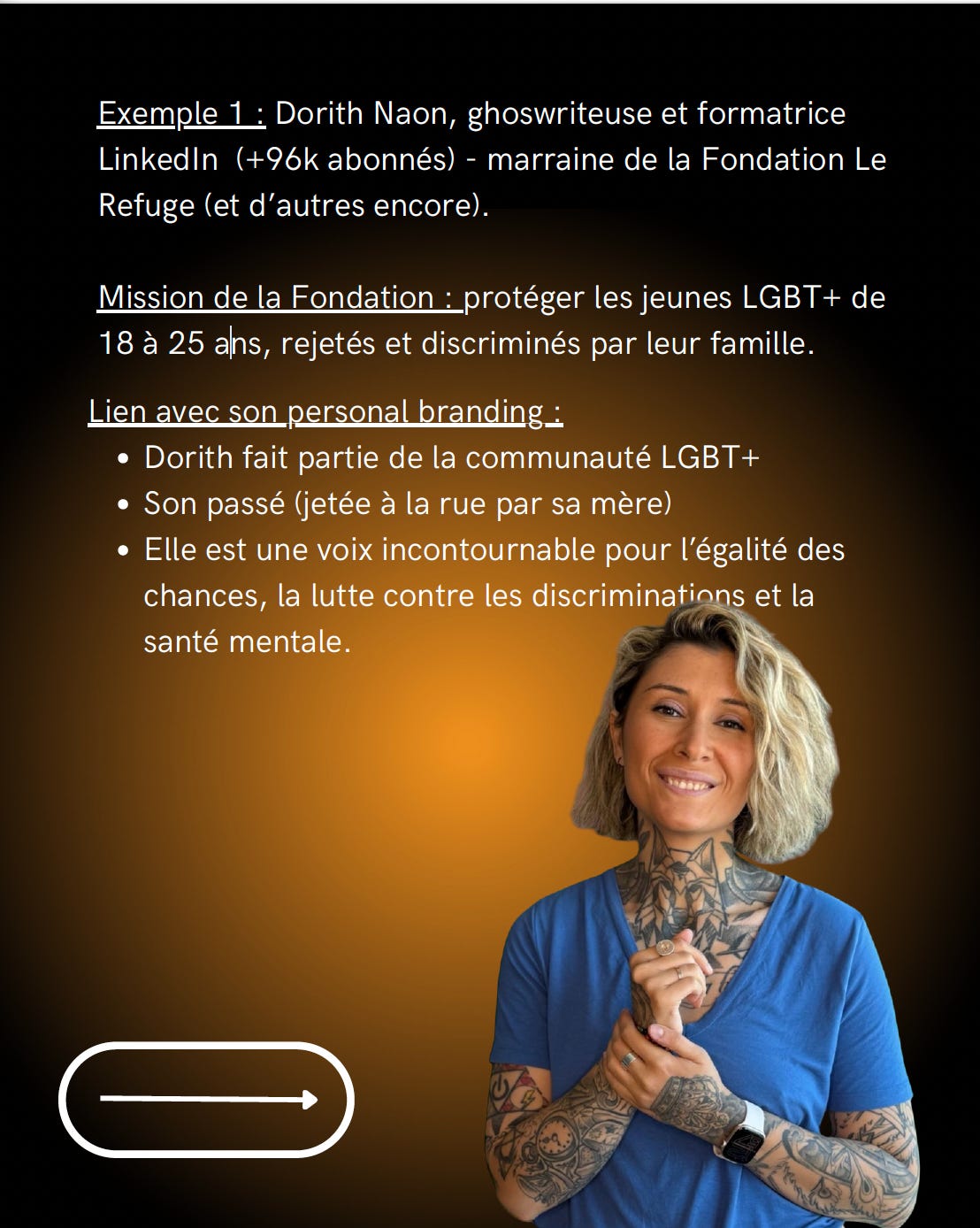 Ce qui est intéressant ici, ce n’est pas la visibilité de Dorith. C’est la cohérence entre son personal branding et la cause soutenue. Dorith :
